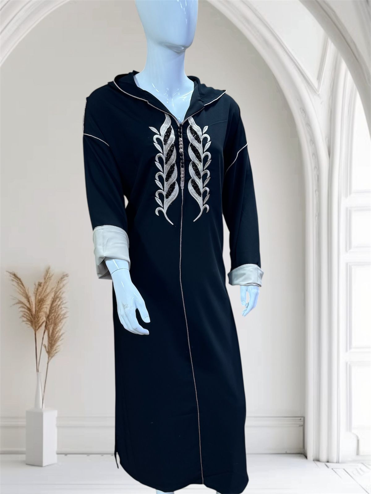 لأسود الملكي مع لمسات بيضاء فضية في الزخارف، مزيج يعكس الذوق الرفيع ويمنحك طابعاً كلاسيكياً لا يشيخ